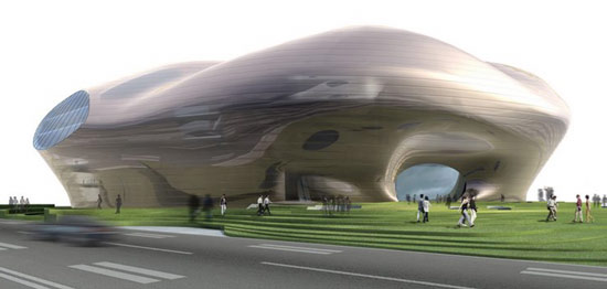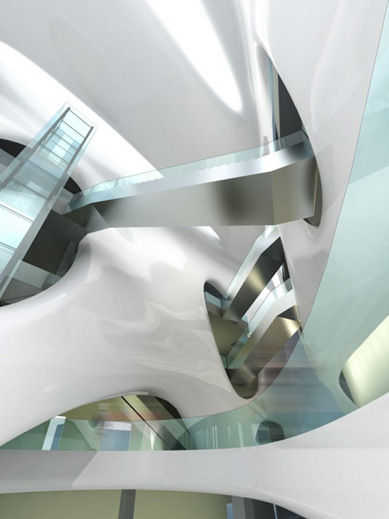 nucleus to contrast with the strict geometry of the masterplan. the structure is wrapped in polished